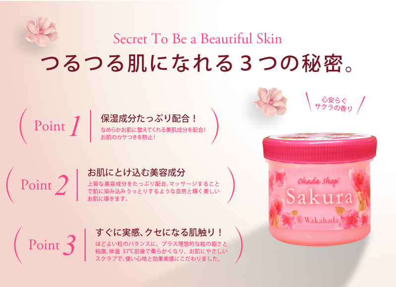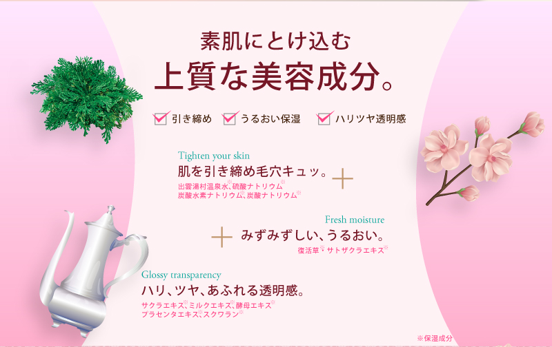 保湿成分たっぷり配合!染井吉野(ソメイヨシノ葉エキス)、里桜(サトザクラ花エキス)、復活草(ハベルレアロドペンシス葉エキス)、牛乳(スキムミルク)を配合、すべすべのなめらかなお肌に整えます。美肌成分のもと、コラーゲンの生成を促進してくれる桜エキス(ソメイヨシノ葉エキス・サトザクラ花エキス)を配合しています。
